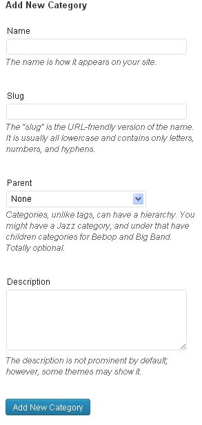 Description. You can write a couple of words about your new category. I do not as my themes do not show a category description. So I leave this alone.