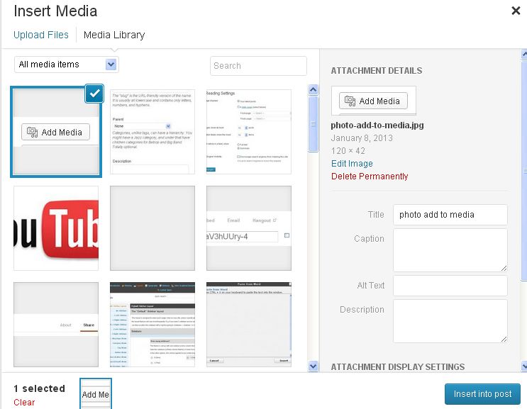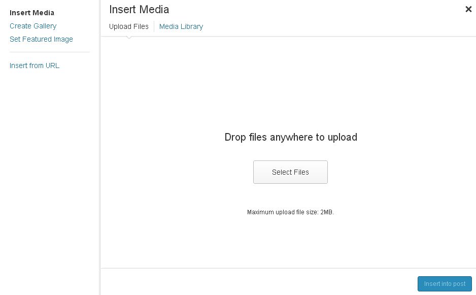 Click on the the select files tab and when you find the photo you want to have in your post or page, click on insert into post.