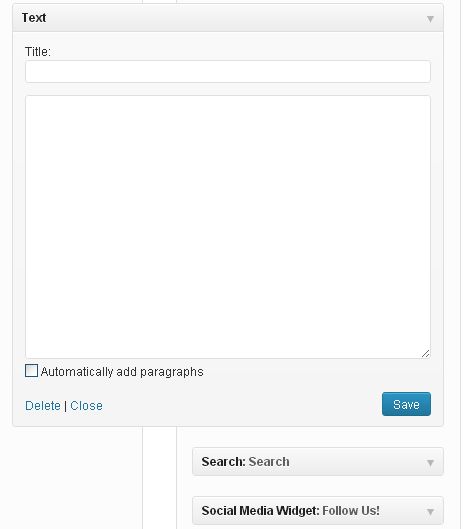 If you want to put information into the sidebar, for example, name and contact details, you go to the Text widget, drag and drop into the sidebar, Put your title for example Contact. Write your information into the main area of the text widget. When you are finished, click on “Automatically add paragraphs” Click on the Save Tab. When it is saved, hit close.